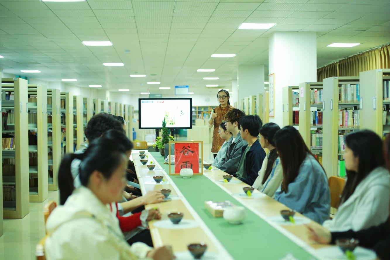 讲座结束后,由图文信息技术中心副主任、副研究馆员焦薇开启谷雨茶会现场体验环节。伴着舒缓轻松的乐曲,同学们围坐茶席,手持建盏,依次品鉴谷雨绿茶和赤壁青砖茶。在鲜爽甜醇的茶香中,回味经典内容,体悟茶之意境,沉浸于书香与茶香交融的悠然时光。
